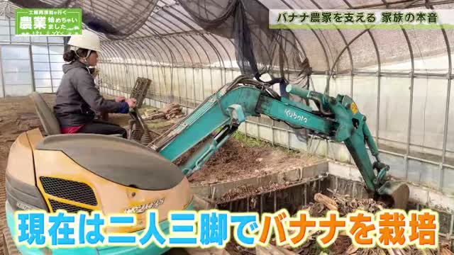 坂田さんのご家族から、3種の国産バナナの差し入れが。工藤さんは、冷凍した「グロスミッシェル」など、それぞれの味の違いを堪能します。専業主婦だった奥様も、今では重機も扱う頼もしいパートナーに。最初は驚いたというバナナ栽培ですが、今では夫婦二人三脚で農園を支えています。