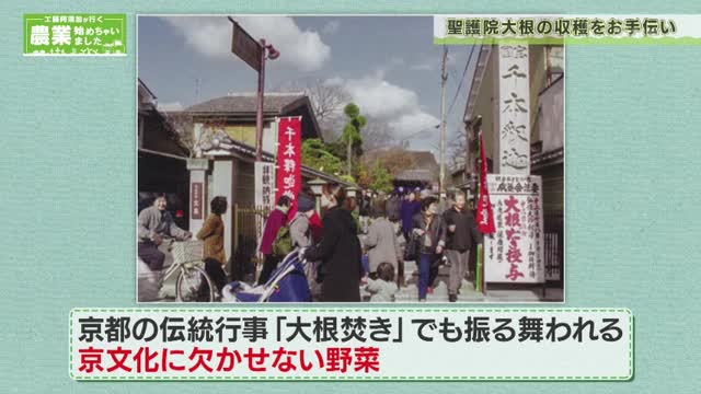 まずは、金時人参や聖護院大根の収穫を手伝います。巨大な聖護院大根に驚きながらも、作業は進みます。京都市内に住む本上さんは、農家が採れたての野菜を直接売りに来てくれる「振り売り」という文化の魅力を語ります。また、自宅で家庭菜園を始めたことで、作物の成長を「待つ」ことの大切さを学び、それが子育てにも通じる気づきになったと話しました。