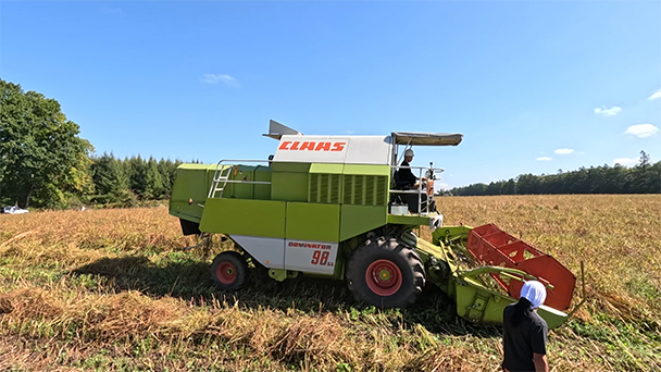 また、全長約10メートル・総重量8.5トンの大型コンバインに乗って、工藤がそばの収穫を体験。