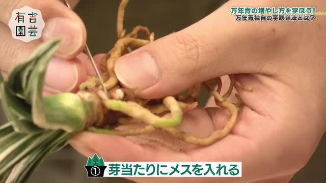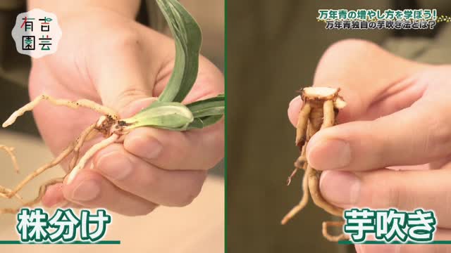 番組の最後には、万年青の独特な増やし方である「芋吹き」について学びます。一般的な「株分け」とは異なる、より丈夫な苗を育てるための方法です。