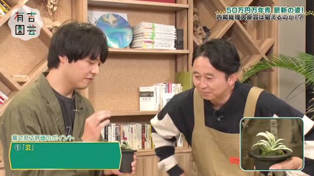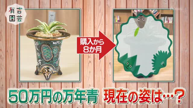 万年青の専門家、酒井宏幸先生が登場し、有吉園芸が購入した50万円の万年青「文晁(ぶんちょう)」の現在の状態を披露。購入から8か月が経過し、中央の葉が伸びるなど順調に成長している様子が確認されました。