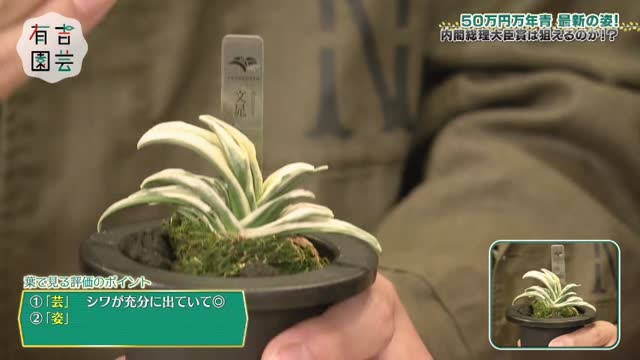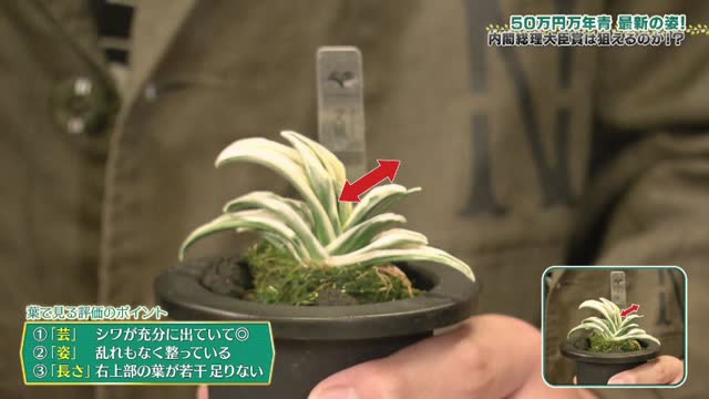 全国大会で受賞できるか、酒井先生が「芸」「姿」「長さ」の3つのポイントで万年青を評価。受賞の可能性を探ります。