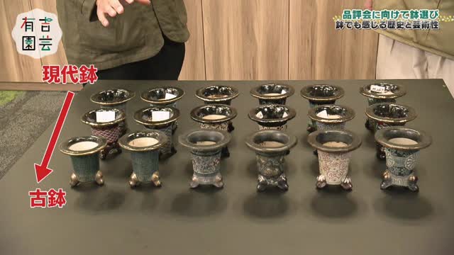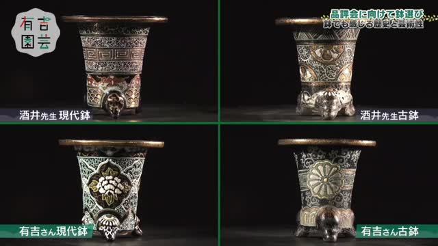 有吉さんは、涼しげな青い七宝柄が特徴の現代鉢と、表面のざらつきが味わい深い古鉢を選択。一方、酒井先生は品評会で映えるとして、黒地に金色の絵柄と細やかな模様の現代鉢と古鉢を選びました。