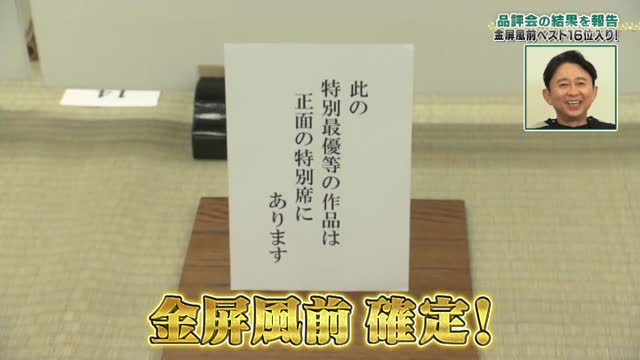 会場奥の金屏風の前には、特別賞を獲得したベスト16の万年青が飾られています。もしここに「此の特別最優等の作品は正面の特別席にあります」という札があれば、ベスト16入りが確定。そして、文晁部門にその札が置かれているのを発見し、有吉さんの万年青がベスト16に入ったことが確定しました。