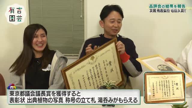 6位入賞を果たした「文晁 有吉弘行」は、「東京都議会議長賞」を受賞。立派な賞状と、受賞した万年青の写真、そして名前入りの立て札が贈られました。有吉さんは「喫茶店でも始めようかな」とご満悦の様子でした。