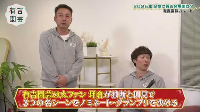 新年最初の放送は、2025年の名場面を振り返る「有吉園芸アワード」。選考委員には、園芸にハマって番組の大ファンになったという我が家の坪倉由幸さんが登場。坪倉さんが独断と偏見で選んだ3つの名シーンからグランプリを決定します。