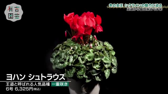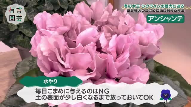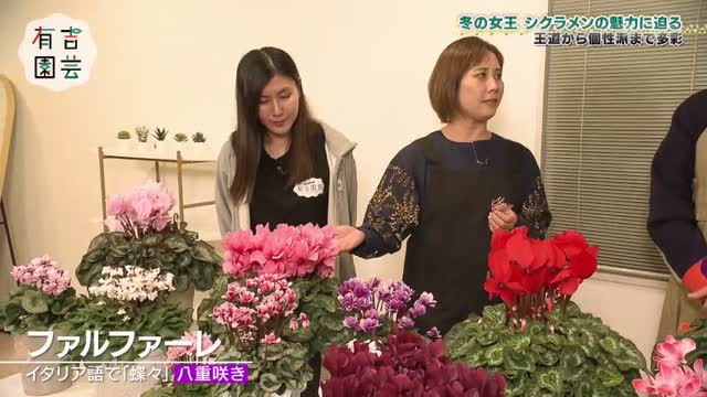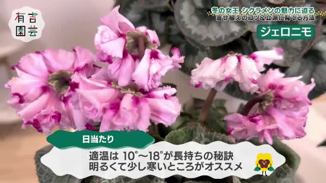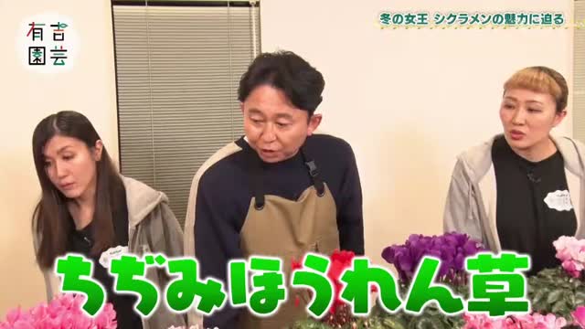 今回は、冬に咲く代表的な花「シクラメン」を大特集。王道から個性派まで、60種類以上あるという多様な品種の魅力に迫ります。園芸部員の丸山桂里奈さんは、シクラメンを使った寄せ植えに挑戦。さらに、シクラメンを長く楽しむための育て方のコツも。後半は、オフィスで育てている観葉植物に関するお悩み相談も。時に飛び出す有吉さんの辛口評価も見どころです。