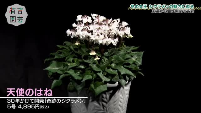 30年かけて開発された「奇跡のシクラメン」と呼ばれる「天使のはね」。ふんわりとした花びらと、有吉さんが「ちぢみほうれん草」と評した特徴的な葉が魅力。寒さに非常に強く、屋外でも育てられる丈夫な品種です。