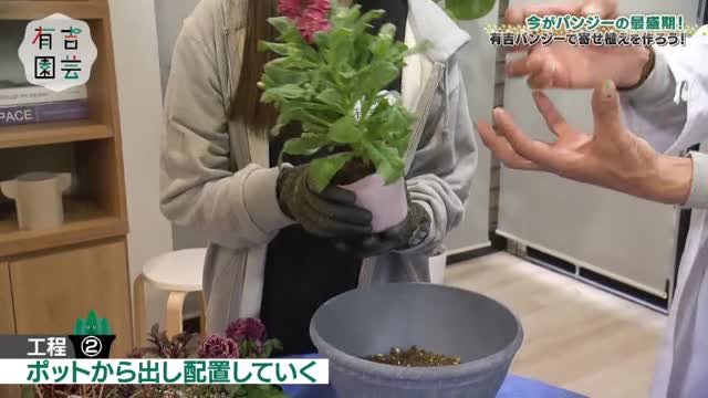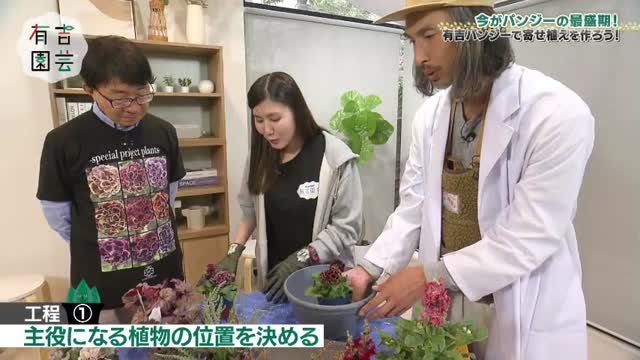 完成した有吉パンジーを使い、寄せ植えに挑戦。多肉植物の専門家・片岡竜二先生の指導のもと、園芸初心者の薄幸さんが有吉パンジーを使った寄せ植えに挑戦します。