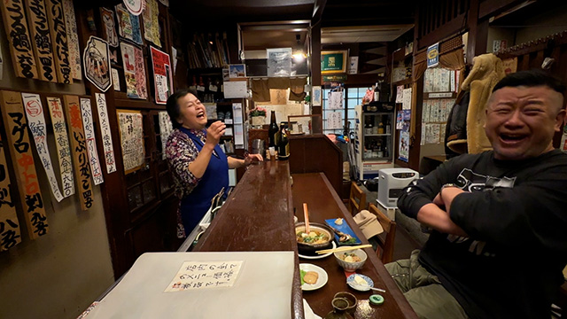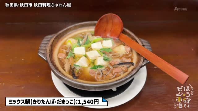 夜の街に繰り出したケンコバさんが訪れたのは、秋田の郷土料理が楽しめる「秋田料理 ちゃわん屋」。店内はカウンター席と小上がりがあり、壁には手書きのメニュー札がずらりと並び、温かい雰囲気に包まれています。まずはビールで乾杯し、お通しの「とんぶり豆腐」や「いぶりがっこクリームチーズ」を注文。続いて、秋田名物の「ハタハタ醤油焼」や、きりたんぽとだまっこが一度に味わえる「ミックス鍋」を熱燗と共に堪能。女将さんとの会話も弾み、秋田の夜を満喫しました。