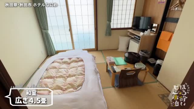 JR秋田駅から徒歩5分という好立地にある「ホテルなにわ」。1966年創業で、家族経営ならではのアットホームな雰囲気が魅力のビジホです。ケンコバさんが宿泊するのは4.5畳の和室。館内には24時間利用可能なひのき風呂があり、いつでも入浴を楽しめます。また、共用スペースには漫画コーナーも完備されており、洗濯をしながら懐かしい漫画を読むこともできます。朝食は1階の食堂で、女将さん手作りの日替わり定食がいただけます。
