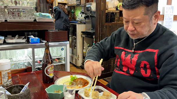 今宵のケンコバは埼玉県春日部市。駅からほど近い、居酒屋や宴会場を備えるビジホへチェックイン。まさに完結型のビジホで一息ついた後は、歓楽街をぶらつきます。たどり着いたのは定番メニューから刺身や鍋まで幅広いラインナップが楽しめる、ホテルと同じ系列のお店。手作りシューマイやハンバーグ、カレーライスなどと瓶ビールでほろ酔いになります。〆はホットコーヒーで。