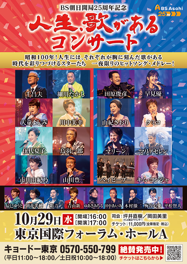 「BS朝日開局25周年記念 人生、歌がある コンサート」 https://www.bs-asahi.co.jp/event/20251029/