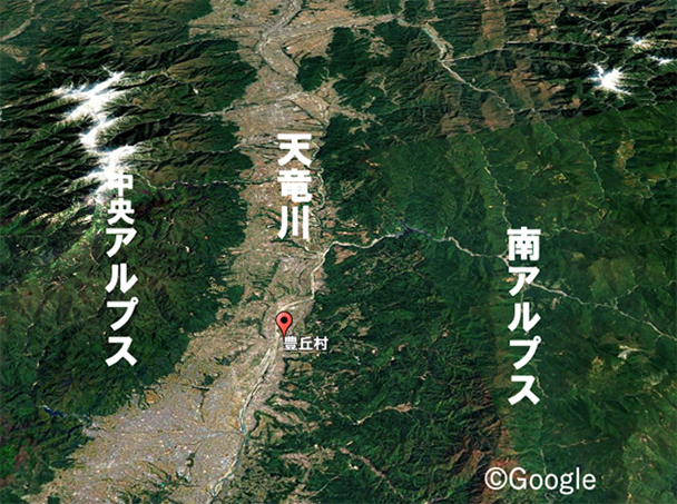 2枚の写真は同じように見えてしまいますが、実は豊丘村は、西側に中央アルプス、東側に南アルプスという3000m級の山に囲まれる谷にあるということです。(図①)