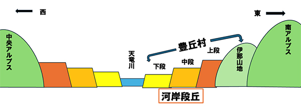 谷は南北に流れる天竜川(日本で9番目の長さ)が作ったもの。両岸に日本一とも言われる「河岸段丘」が階段状に広がり、天竜川の東側の河岸段丘の上にある村が豊丘村なのです。東西で切った断面図にすると図②のようになります。
