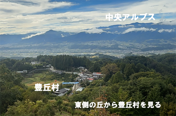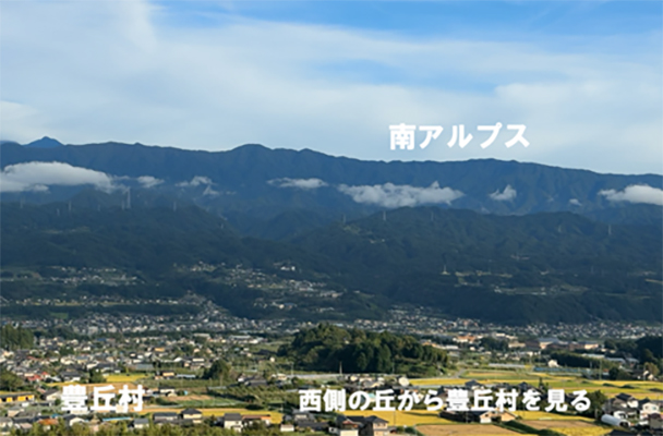 今回取材した長野県豊丘村で驚いたことは、その地形です。 写真①は、西側の丘から豊丘村を撮影したもの。奥に南アルプスが山々が見えます。 写真②は、東側の丘から豊丘村を撮影したもの。奥に中央アルプスの連なりが見えます。