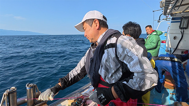 漁も独特!はえ縄と刺し網の中間で、はえ縄の要領で2m間隔で丸い網を仕掛けとして沈めていく珍しい漁。果たして結果は?