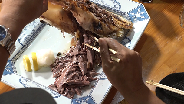 極上!赤身、中トロ、大トロの刺身&握り寿司、巨大カマの丸焼きに大感激!