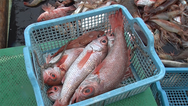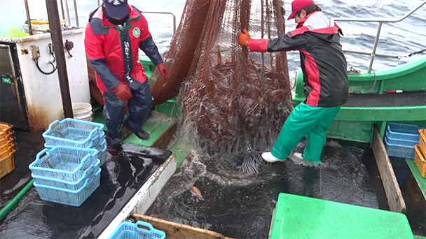 青森県との県境に位置し、秋田県内最北端の漁港で、マダイの底曳網漁に同行。