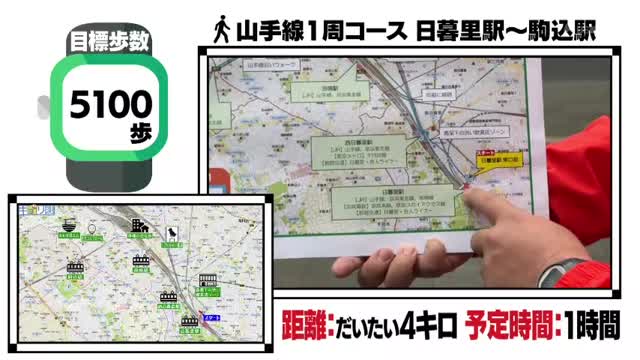 山手線1周コースの第5弾は、前回のゴール地点である日暮里駅からスタートです。ひむ太郎は「半分はまだいけてないのかな?今日で半分いこうじゃないか」と意気込みます。今日のコースは日暮里駅から西日暮里駅、田端駅を通り、駒込駅まで。目標歩数は5100歩です。