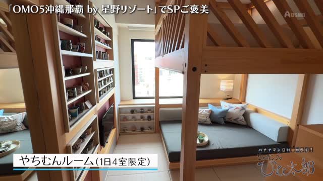 ひむ太郎が宿泊するのは、1日4室限定の「やちむんルーム」。部屋に入ると、壁一面に飾られたやちむん(沖縄の焼き物)と、秘密基地のような2段ベッドがお出迎え。「うわ、かわいい!」「おいおいおい、頼むよ、かわいすぎるって」と、そのユニークな内装に大興奮のひむ太郎でした。