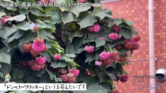 やちむん通りから少し入った住宅街を歩くひむ太郎。垂れ下がるように咲く「ドンベヤ・ワリッキー」という珍しい花や、沖縄ならではの石垣など、見るものすべてが新鮮なようです。「初めて来ました。沖縄結構来てんのに知らないもんすよね」と、新たな発見を楽しんでいました。