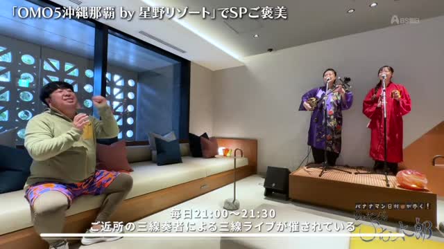 夜になると、ホテル内でご近所の三線奏者によるライブが開催されます。沖縄民謡の演奏に合わせて、ひむ太郎も「イーヤーサーサー!」と掛け声をかけ、沖縄の夜を存分に楽しんでいました。