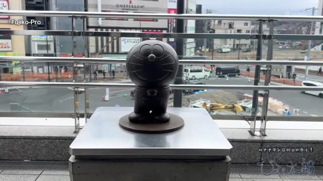 駅の階段を下り始めると、エスカレーターの壁面にパーマンやキテレツ大百科など、藤子・F・不二雄作品のキャラクターたちのイラストがずらり。「じじいになったのび太実写版あったらぜひ私にオファーしてほしいぐらい。のび太感出してるつもりでいるんですけど、どうですか?」と、実写版のび太役への意欲(?)を見せていました。さらに、駅を出ると、藤子・F・不二雄ミュージアム行きのドラえもんデザインのバスも発見。街全体が作品の世界観に包まれていることを実感しました。