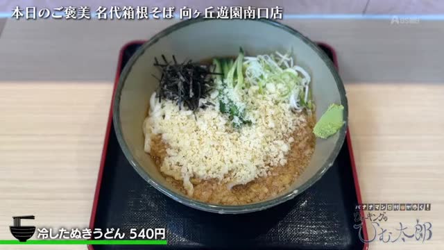 ウォーキングの締めくくりは、向ヶ丘遊園駅南口にある「名代箱根そば」へ。ひむ太郎は「冷やしたぬきうどん」を注文。歩いた後の一杯は格別のようで、「うまい!」「麺もっちもちだ」と、美味しそうにうどんをすすっていました。