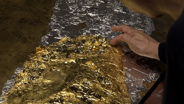 伝統工芸・西陣織に織り込まれる、きらびやかな金箔。現代では建築素材や食べ物まで幅広く用いられている。箔とは、金や銀などの金属類を、およそ1万分の1ミリまで薄くのばした、きわめて繊細な素材。その伝統技術を受け継ぎながら、現代アートへと昇華させているのが、裕人礫翔(63)だ。