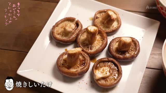 続いて焼きしいたけの調理へ。青果店で教わった通り、軸に十字の切れ目を入れ、傘を下にしてじっくり焼いていきます。焼き始めて8分、傘の裏に水分が出てきたのを確認し、裏返してさっと焼いたら焼き上がり。しょうゆと七味で味付けをして完成です。