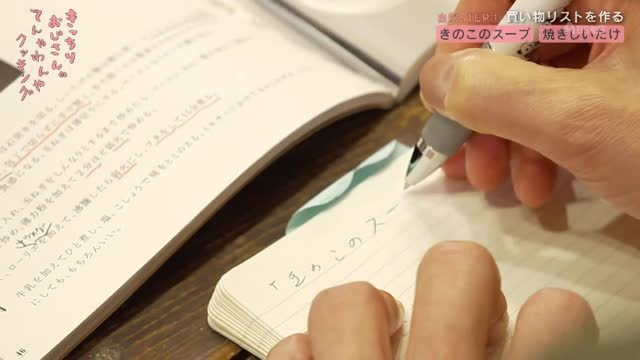 今回作るのは「きのこのスープ」と「焼きしいたけ」。きのこ料理と聞いて、過去に石づきごと調理して失敗したえのき料理を思い出しながら、「あれは間違った食べ方だった」と反省しつつも、そもそもきのこにはあまり興味がない様子。「ないでしょだって、もう絶対今日はきのこ!って」「そういう人いるのかな?すごい食いたくなる人」とスタッフに問いかけますが、誰の手も挙がらず、少し寂しそうな表情を見せながらも、黙々と買い物リストを作成しました。