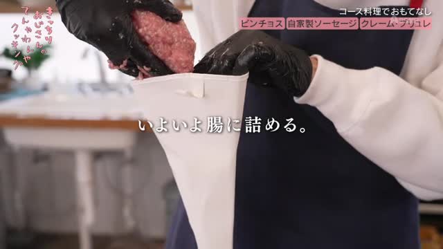 ソーセージ作りで最も難しい腸詰めの作業。塩抜きした豚腸を口金にセットするだけで大苦戦。「想像通り、俺は手先が不器用だからここ一番苦労する」と語る通り、作業はもはや苦行のよう。時間も迫る中、焦りながらもなんとか肉を詰めていきますが、この苦行の続きはまた次回へ…。