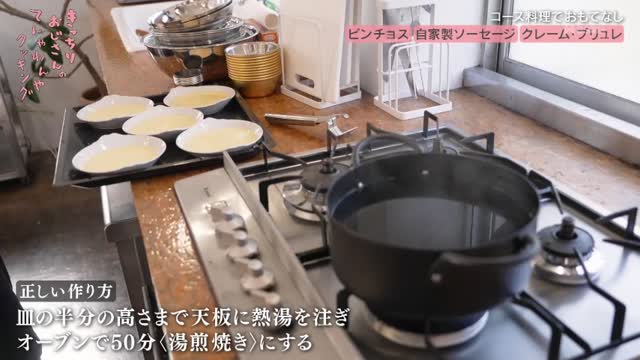 クレーム・ブリュレの調理で最大の難関が、オーブンでの湯煎焼き。天板に熱湯を注ぐ工程で「どうやろう?」と頭を悩ませます。こぼさないようにオーブンに入れてからお湯を注ぐ作戦を立てますが、熱いお湯を運ぶだけでも一苦労。なんとか成功させますが、いきなりの正念場に肝を冷やしました。