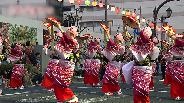 花笠太鼓が真夏の夜に響き渡り、あでやかな衣装に身を包んだ踊り手が