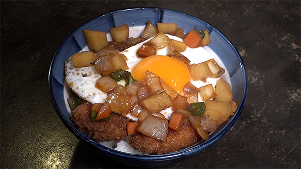 一口カツに煮込んだ野菜を重ね、仕上げは半熟の目玉焼き。