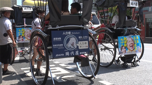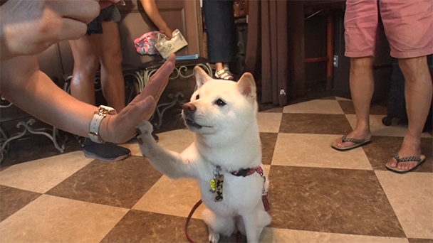 人懐っこい性格で、お客様を吠えることなくお出迎え。さらには「お手」「おまわり」「ハイタッチ」まで披露するフレンドリーさで、国内外の観光客だけではなく、炎天下で働く車夫のお兄さんたちもメロメロ。みんなに愛されるワークワンの奮闘ぶりをご覧ください!