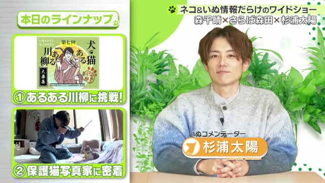 今回は、ゲストに杉浦太陽さんを迎え、寒がりなネコいぬたちの可愛い動画や、恒例の「犬猫あるある川柳」、保護猫写真家の活動などを紹介しました。