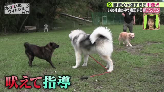 この日、しつけのためにやってきたのは、生後7ヶ月のアラスカン・マラミュート「ゆき」。他のいぬを追いかけ回すゆきに対し、甲斐犬が吠えて指導すると、ぴたりと追いかけるのをやめました。その後、お尻の匂いを嗅いで初めての挨拶を交わすことができ、いぬ社会のルールを学んでいました。