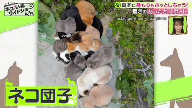 ネコ写真家の森永さんが撮影したのは、地域ネコたちが集まって暖め合う「ネコ団子」。その数なんと15匹。強風の寒い日、ネコたちは団子になったり崩れたりを繰り返していたそうです。