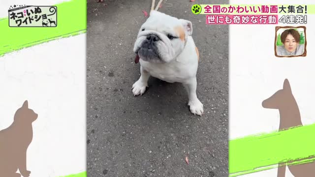 ブルドッグのどん兵衛くんは、電車と競争するほどかけっこが大好きで元気いっぱい。しかし、ワンちゃんとは思えない奇妙な声で鳴く一面も。飼い主さんによると、口からではなく鼻から音を出しているそうで、3年ほど前から不満があるとこの音を出すようになったといいます。この時はおやつが欲しくてアピールしており、結局1歩も動かず、体重20キロのわがままボディを飼い主さんに抱っこされて帰ることになりました。