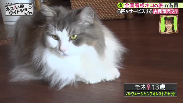 ノルウェージャンフォレストキャットのモネちゃんは、お客さんの背中を渡り歩くというサービスで人気を集めています。フワフワの毛並みも魅力的です。