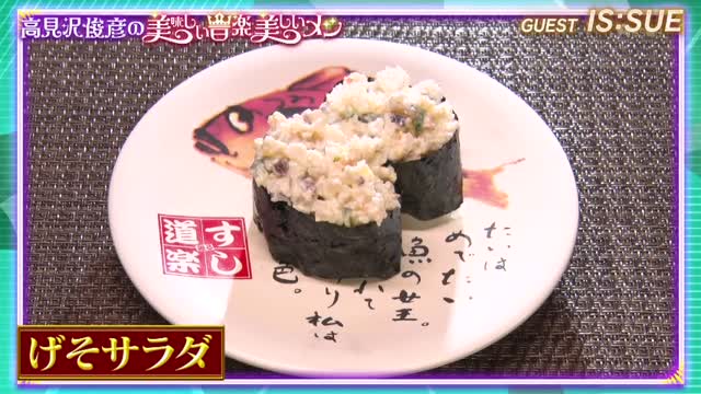 続いて、新潟県出身のNANOさんが「私のソウルフード」と語るのが、新潟県にある回転寿司チェーン店「すし道楽」の「げそサラダ」。最高級ブランド米「塩沢産コシヒカリ」のシャリの上に、大型のイカから獲れたゲソと独自ブレンドのマヨネーズを和えたサラダが乗った軍艦巻きです。コリコリとしたゲソの食感が特徴で、高見沢さんは「美味しくないはずがない」と一口。初めて食べたというYUUKIさんとRINOさんも、そのおいしさに驚きの表情を見せていました。