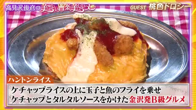 まず紹介されたのは、石川県金沢市にある洋食店「グリルオーツカ」の「ハントンライス」。ケチャップライスの上に玉子と魚のフライを乗せ、ケチャップとタルタルソースをかけた金沢発祥のB級グルメです。ハキイ。さんは「絶対高見沢さん好きです、これ」と自信満々。試食した高見沢さんは「う~ん、ビブラート!」とその味に感動。キシベさんは、卵を3個分使っているためタンパク質が豊富で、肉体労働であるドラマーには最適な一品だと語りました。