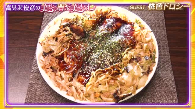 続いては、広島市にあるお好み焼き店「常太郎」。桃色ドロシーが広島でライブをする際には必ず訪れるというお気に入りのお店で、店主にお願いして「桃色ドロシースペシャル」というオリジナルメニューまで作ってもらったそうです。トッピングはチーズとキムチで、厚めに切ったキャベツの食感が特徴です。さらに上級者向けとして納豆を追加するのがおすすめだとか。スタジオには店主自らが登場し、出来立てのお好み焼きを高見沢さんに振る舞いました。高見沢さんはこの味をたいそう気に入り、後日、広島でのコンサートの際にテイクアウトしたほどでした。