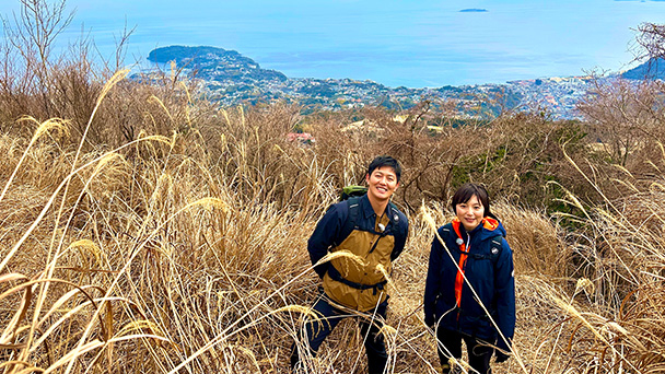 最後はいよいよ南郷山の山頂へ。そこには相模湾と真鶴半島を間近に望む大パノラマが!さらには、海上に浮かぶ初島も見ることができました。本上さんと工藤さんによる、和やかな掛け合いの山行は必見です!!