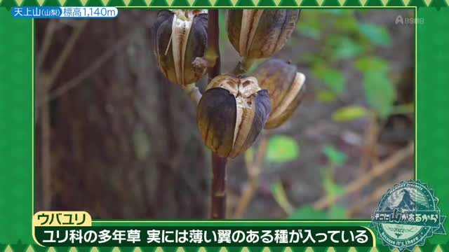 道中、南沢さんは不思議な形をした植物を見つけました。これは夏に大きな花を咲かせる「ウバユリ」の実。熟すと割れ目から翼のある種が風に乗って飛んでいくそうです。
