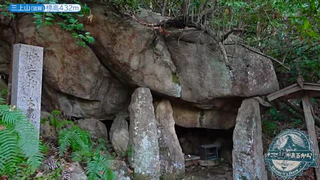 麓の御上神社で安全を祈願し、登山を開始した本上さん。清々しい朝の空気の中、歩みを進めると、道は二手に分かれます。寄り道した先で本上さんが発見したのは、巨大な岩で組まれた「岩神大龍神の岩屋」。実はこの岩屋、元々は古墳で、その洞穴が祠として利用されているとのこと。龍神が祀られているという神秘的な空間に、本上さんも思わず手を合わせます。