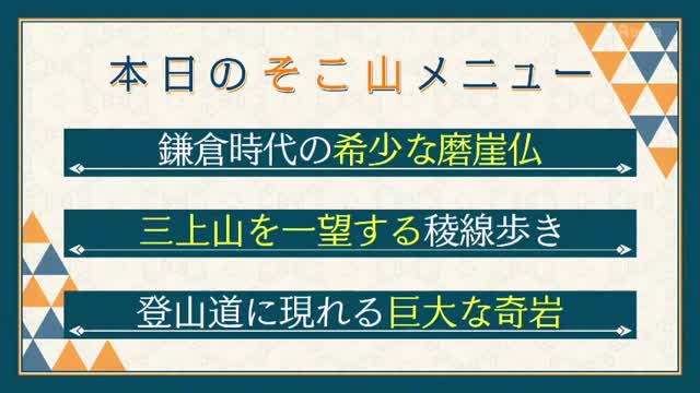 磨崖仏を後にして、最初のピーク「妙光寺山」(標高267m)に到着。山頂からは、目指す三上山の美しい姿がくっきりと見えます。ちょうど太陽が真上にあるため、三上山は黒いシルエットとなって浮かび上がり、その神々しい姿に本上さんも感動。ここから始まる絶景の稜線歩きに期待が膨らみます。