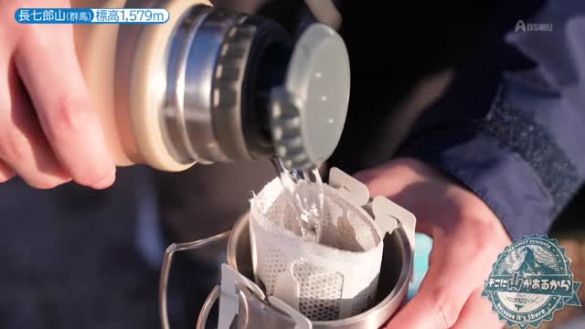 長七郎山の中腹、視界が開けた広場で一休み。浅間山や榛名山などの名峰を眺めながら、持参したお湯でドリップコーヒーを淹れます。冷えた体に温かいコーヒーが染み渡り、「あー、美味しい」と至福の表情。美しい景色の中でのコーヒータイムは、登山の醍醐味の一つです。